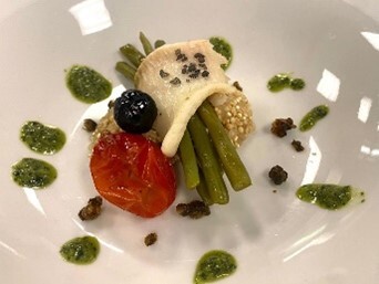 Tarbotfilet met daarin gerold haricots verts, gegarneerd met gebakken rode poon, gepofte cherrytomaat, knapperige kappertjes, peterselie-citroenolie.