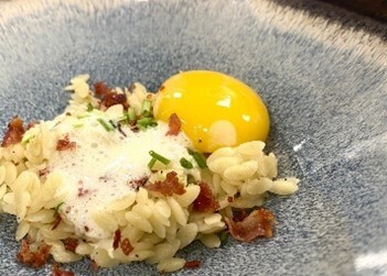 Orzo met een 64 graden-eitje gegaard in de sous-vide, met schuim van Parmezaanse kaas en crumble van spek.