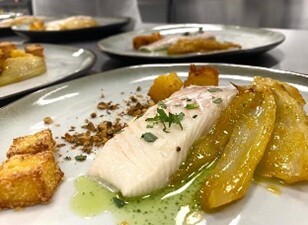 gepocheerd in courtbouillon, met een saus van witte wijn, sjalot en crème fraîche, venkel gekaramelliseerd in sinaasappelsap, krokantjes van polenta met spek op twee manieren: met Parmezaan uit de oven en gebakken in de olie, gegarneerd met kruim van geroosterde pistache en dragonolie.