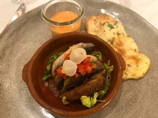In miso gemarineerde portobello’s op een bedje van sla met ingelegde groente, zout en zuur bij elkaar gebracht door een frisse yoghurtsaus, natuurlijk gezoet door geroosterde paprika, tomaat en gepofte knoflook; ‘fingerfood’ huisgemaakte naan flatbread met koriander en komijn.