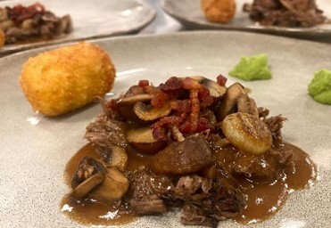 van sucade met ingekookte saus op basis van wijn en gerookt spek, gebakken champignons en zilveruitjes, met aardappelkroketje en dopjes erwtenpuree.