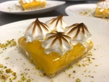 Bodem van zanddeeg gevuld met sinaasappelcurd met een vleugje citroen en Grand Marnier, voorzien van dopjes licht gebrande meringue, temidden van een strooisel van fijngehakte pistachenootjes.